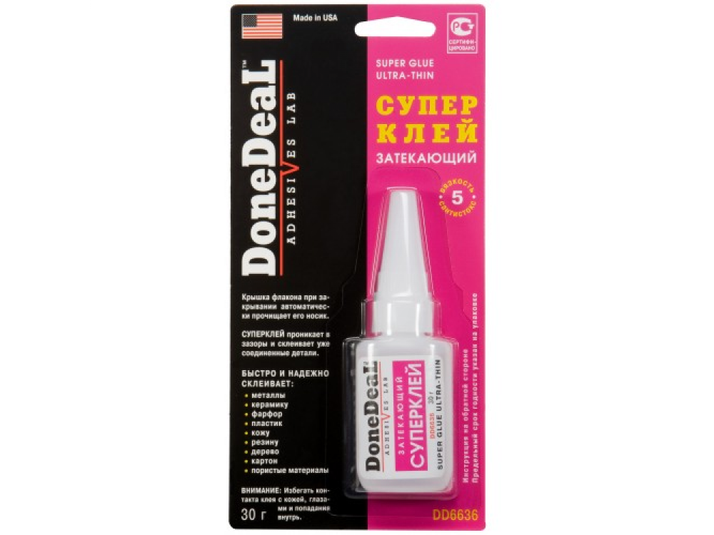 Суперклей затекающий для склеивания различных материалов, обладающий высочайшей текучестью, смачиваемостью и адгезией. Суперклей проникает в зазоры и склеивает уже соединенные детали. Универсальный цианакрилатный клей (суперклей) для быстрого и надежного склеивания различных материалов. Характеристики: Состав - цианакрилат.Цвет - прозрачный.Термоустойчивость - от -50°С до +95 °С.Прочность соединения - 204 кг/см2.Время схватывания - 30 сек.Время отвердевания - 2 мин.Время полной полимеризации - 24ч.Область применения: Быстро и надежно склеивает:металлы;керамику;пластик;резину;фарфор;кожу;дерево;картон;пористые материалы.Особенности и преимущества: DD6636 обладает высокой текучестью, смачиваемостью и адгезией;Выдерживает воздействие высоких температур и большинства агрессивных жидкостей;